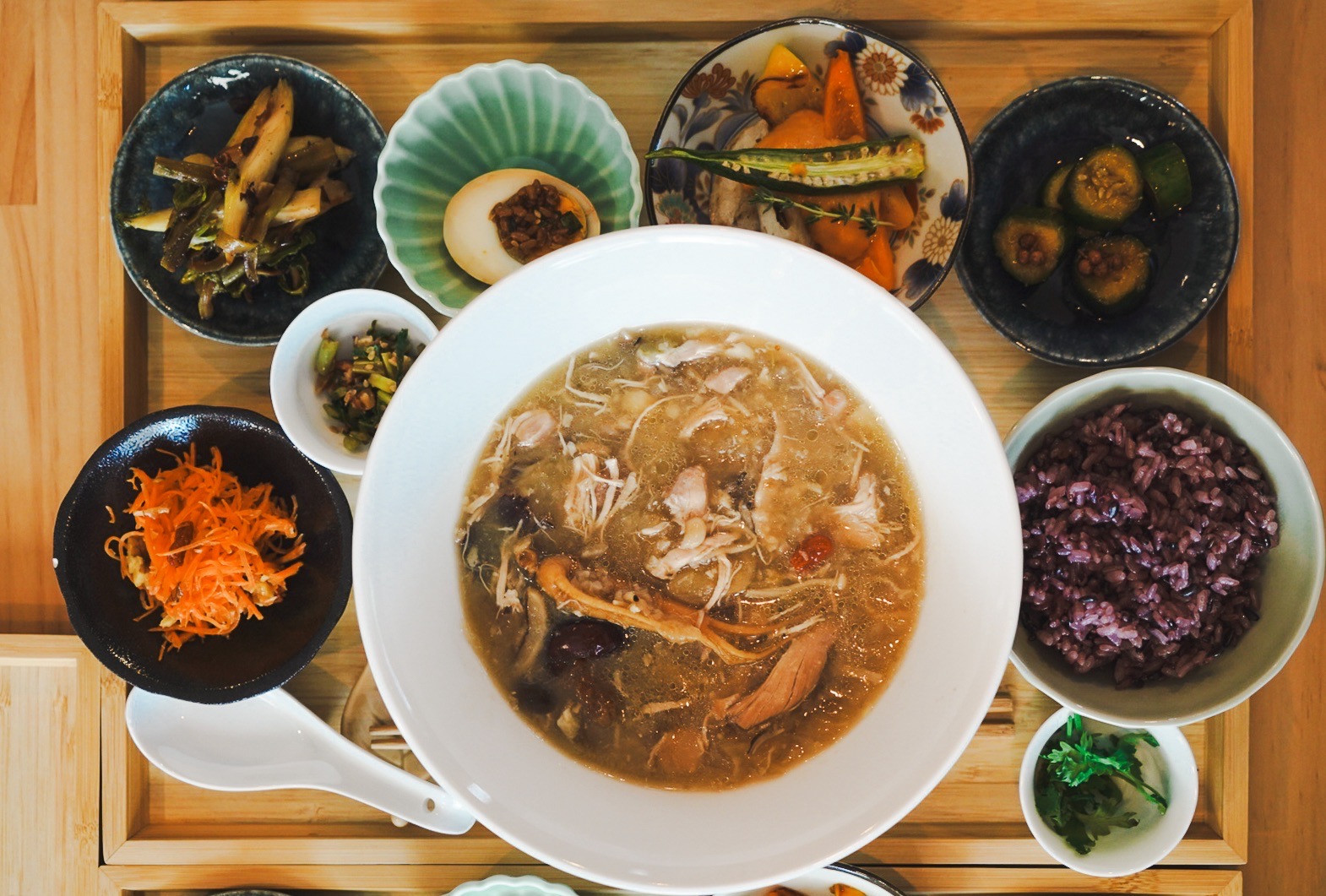 9月メインの薬膳スープは研究室オリジナル参鶏湯(サムゲタン)肺や肌を潤したり、夏に失った気血を補う、美肌と疲労回復の生薬をたっぷり使用して、夏の疲れを秋に持ち越さない施膳でおつくりしました。参鶏湯に入れた高麗人参は中国吉林省産の根を贅沢に使いました。