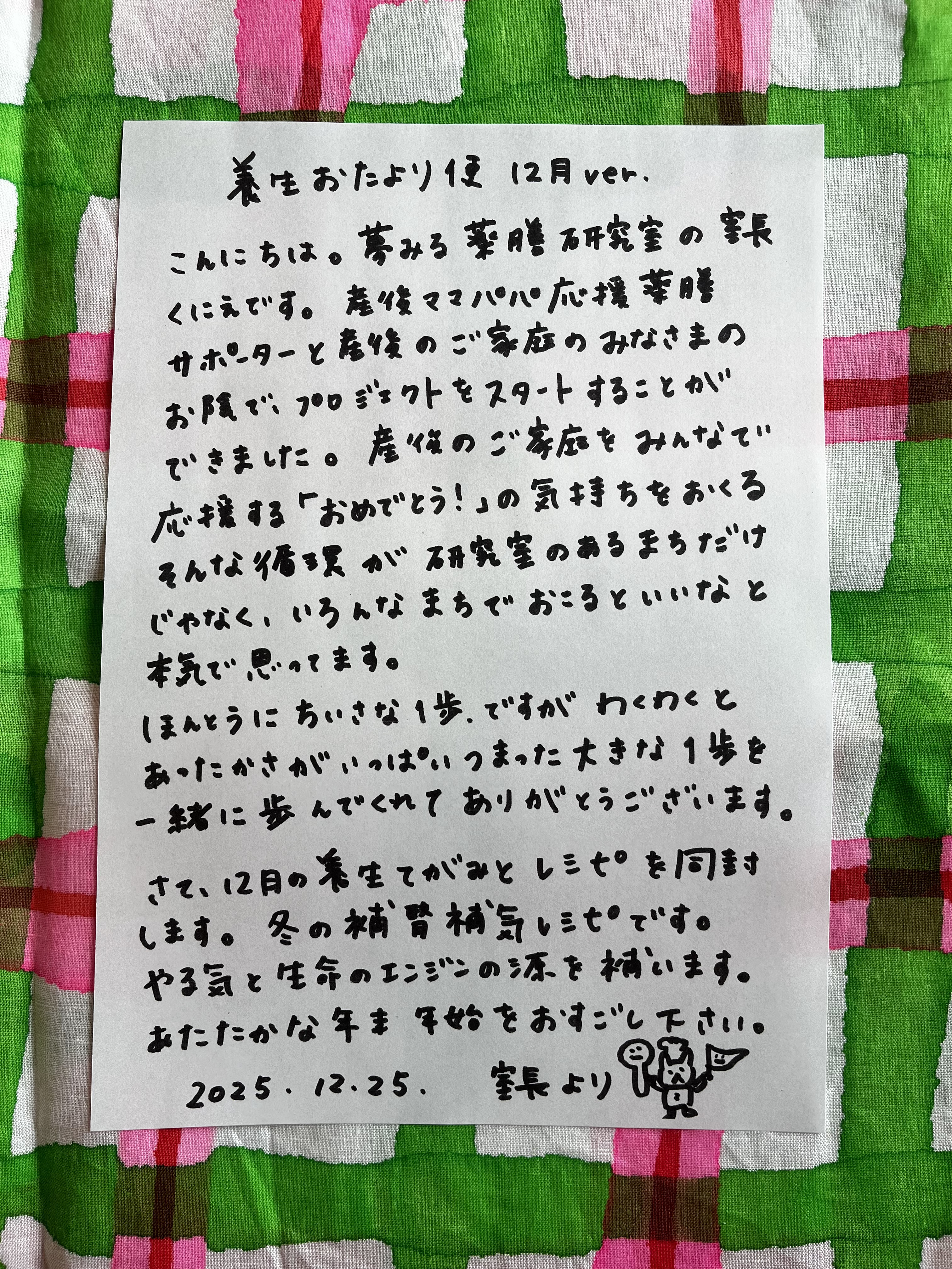 産後ママパパ応援薬膳弁当便!ご登録の産後ご家庭と産後サポーターの方々に毎月お届けする季節の養生お手紙には、身近な食材でほんとうに簡単につくれる薬膳レシピカードを同封しています。